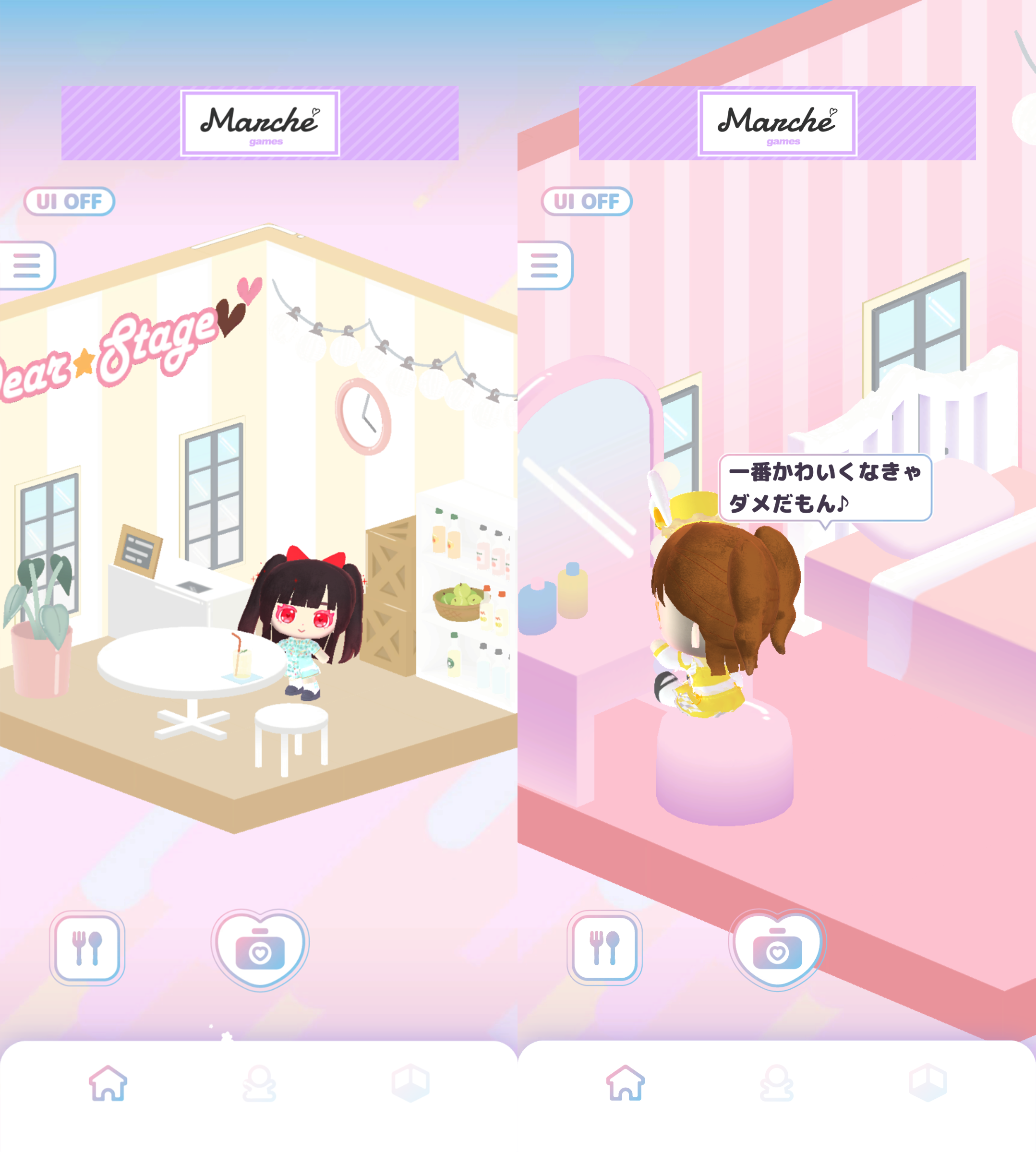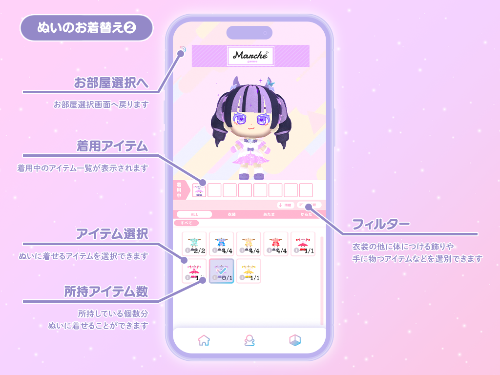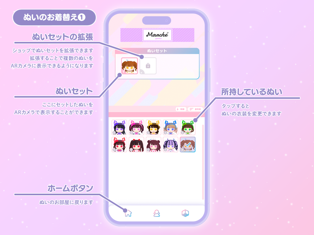 ぬいたちをタップすると愛らしいリアクションを返してくれるほか、おやつをあげたり、自由に家具を配置したりと、ぬいたちが生活する様子を眺めて癒やされることができます。